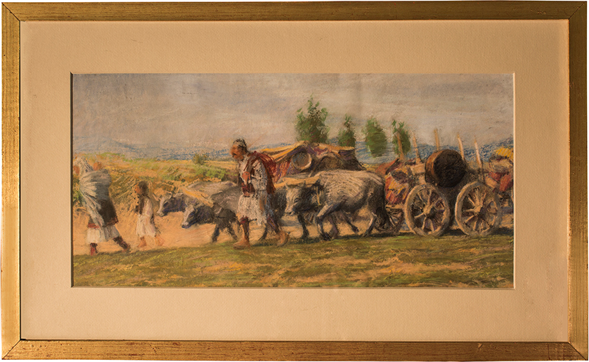 Стеван Милосављевић, Четири вола краља Петра, пастел на папиру, 23 х 47 цм, инв. бр. 558 (96).